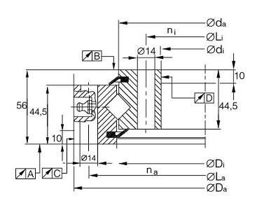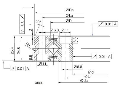 該系列交叉滾子轉盤(pán)軸承為無(wú)齒結構,內圈和外圈上加工有安裝孔,安裝孔可為沉孔、絲孔,外圈外徑上可帶有潤滑油嘴,軸承兩側可裝橡膠密封或雙面彈性簧片鋼制密封,該類(lèi)型軸承有尺寸系列,XSU08系列內徑尺寸范圍為Φ130~Φ360mm、XSU14系列內徑尺寸范圍為Φ344~Φ1024mm。您在選擇此類(lèi)軸承時(shí),可先與我們聯(lián)系,索取軸承工況調查表,填寫(xiě)后回傳至我公司,我們技術(shù)部門(mén)會(huì )根據實(shí)際工況幫助您進(jìn)行軸承選型。