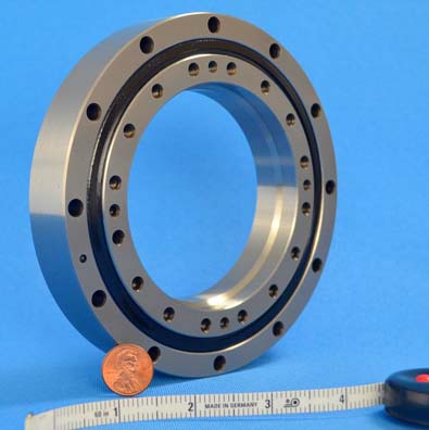 交叉滾子軸承內部結構采用滾子呈90°相互垂直交叉排列,滾子之間裝有間隔保持器或者隔離塊,可以防止滾子的傾斜所滾子之間相互磨察。另外,不會(huì )發(fā)生滾子的方接觸現象或者鎖死現象;同時(shí)因為內外環(huán)是分割的結構,間隙可以調整,即使被施加預壓,也能獲得高精度的旋轉運動(dòng)。