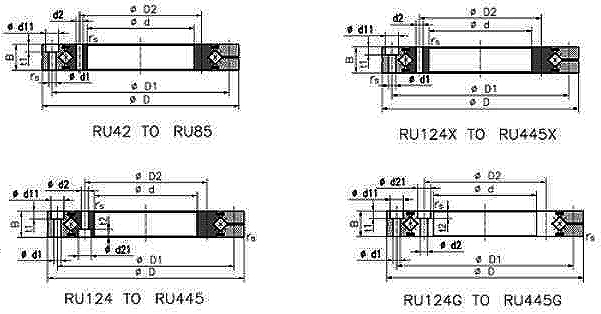 RU系列交叉圓柱滾子軸承結構為內外圈體型設計,由于內外圈已加工了安裝孔,所以不需要固定法蘭和支撐座,縮短了軸向空間距離、優(yōu)化了使用機構;另外,由于帶座的體化內外圈結構,安裝對性能幾乎沒(méi)有影響,因此能夠獲得穩定的旋轉精度和扭矩,外圈和內圈旋轉機構都適用,廣泛應用于機器人腰部關(guān)節、焊接多工位回轉工作臺、通訊雷達、精密測量?jì)x器等等。您在選擇此類(lèi)軸承時(shí),可先與我們聯(lián)系,索取軸承工況調查表,填寫(xiě)后回傳至我公司,我們技術(shù)部門(mén)會(huì )根據實(shí)際工況幫助您進(jìn)行軸承選型。